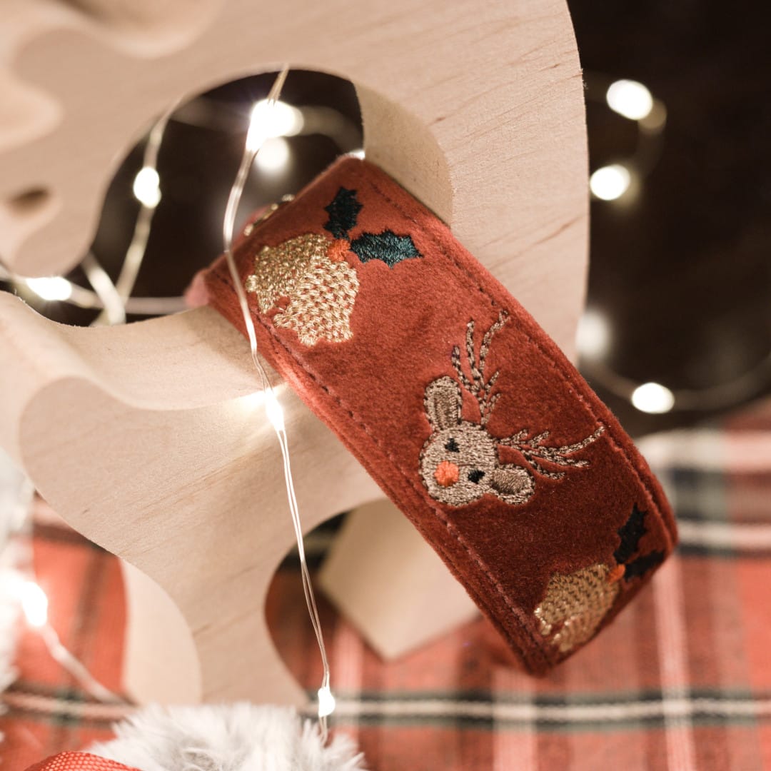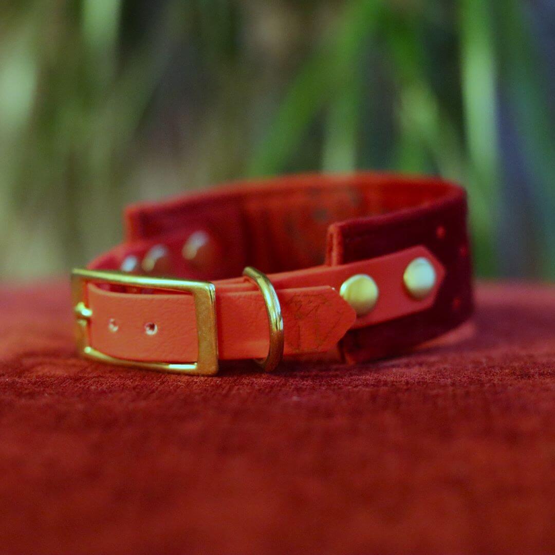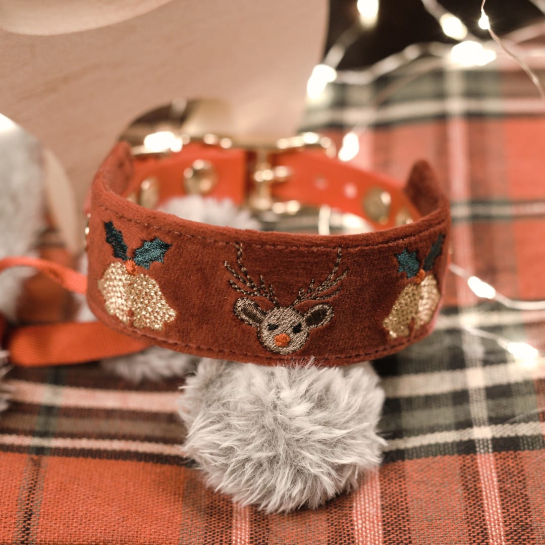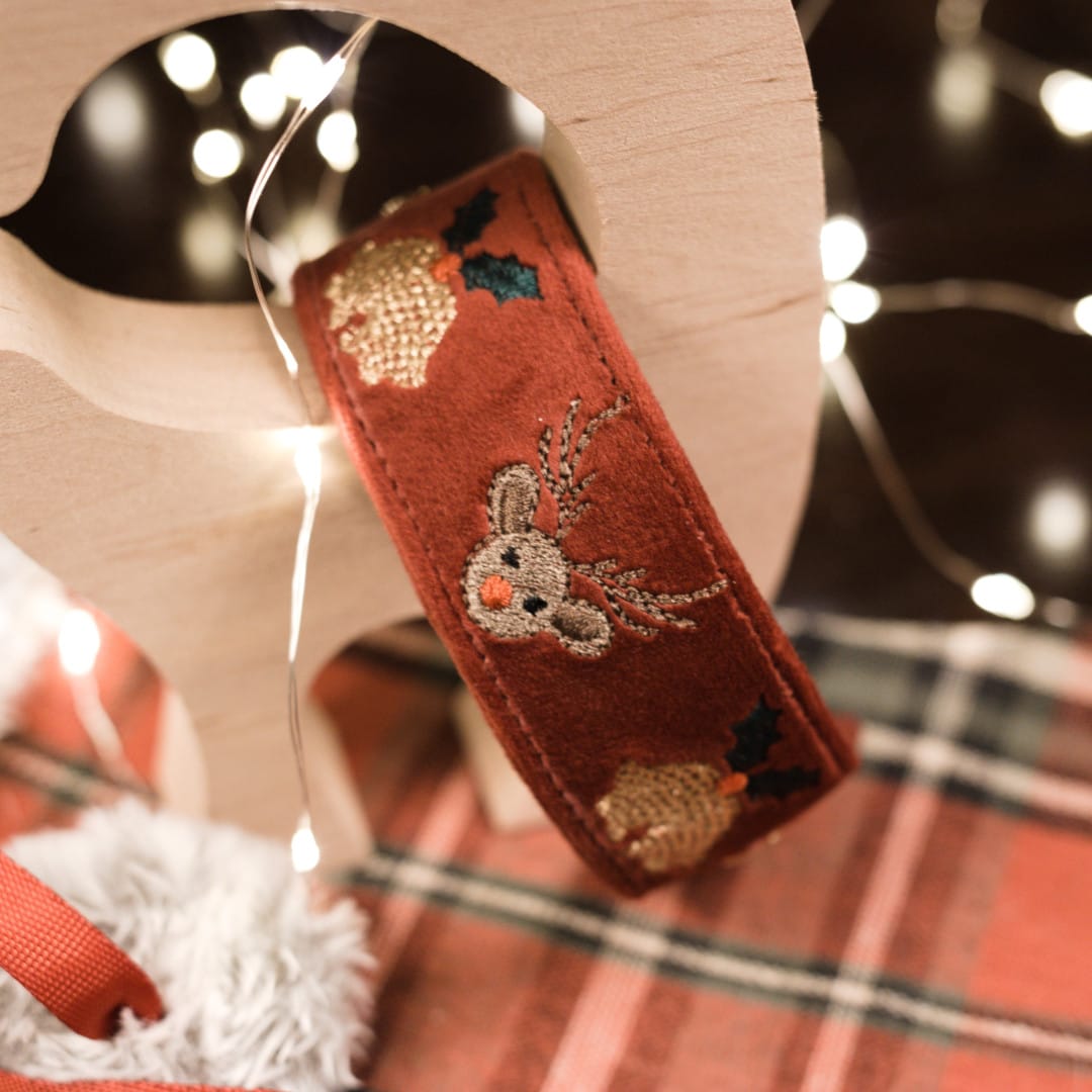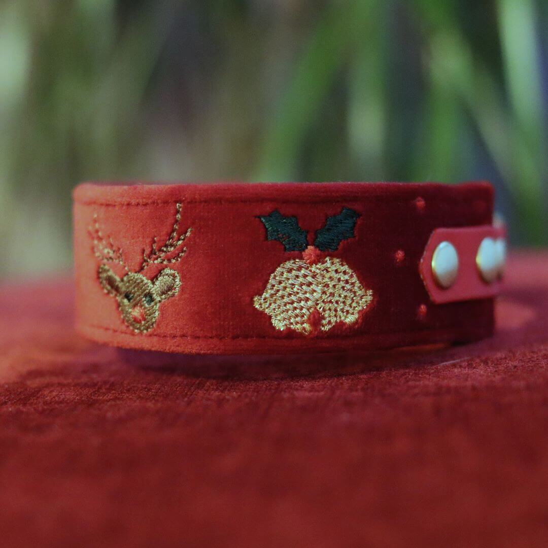 Elegancka świąteczna obroża wykonana z miękkiego welwetu w kolorze Rubaszny Rubinowy, z ozdobnymi elementami wyhaftowanymi nicią metaliczną.
