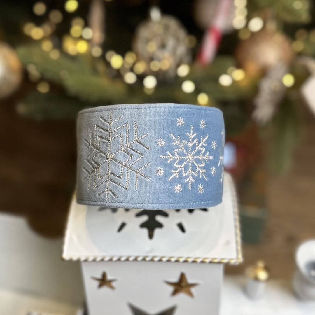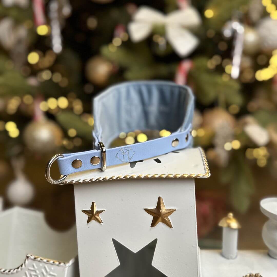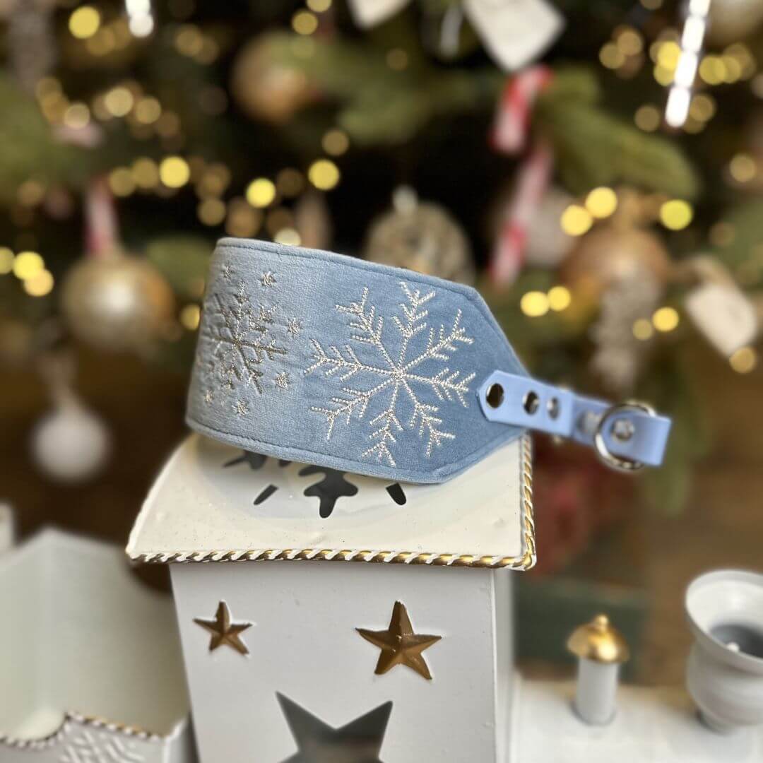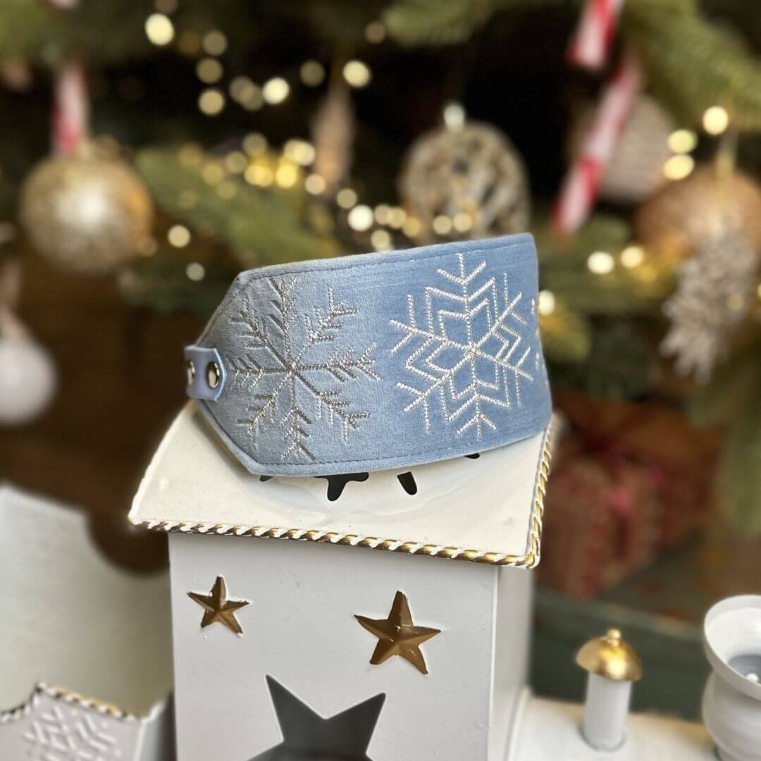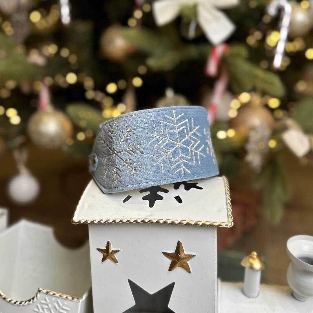 Świąteczna obroża wykonana z miękkiego welwetu w kolorze Boski Błękit, z ozdobnymi elementami wyhaftowanymi nicią metaliczną.
