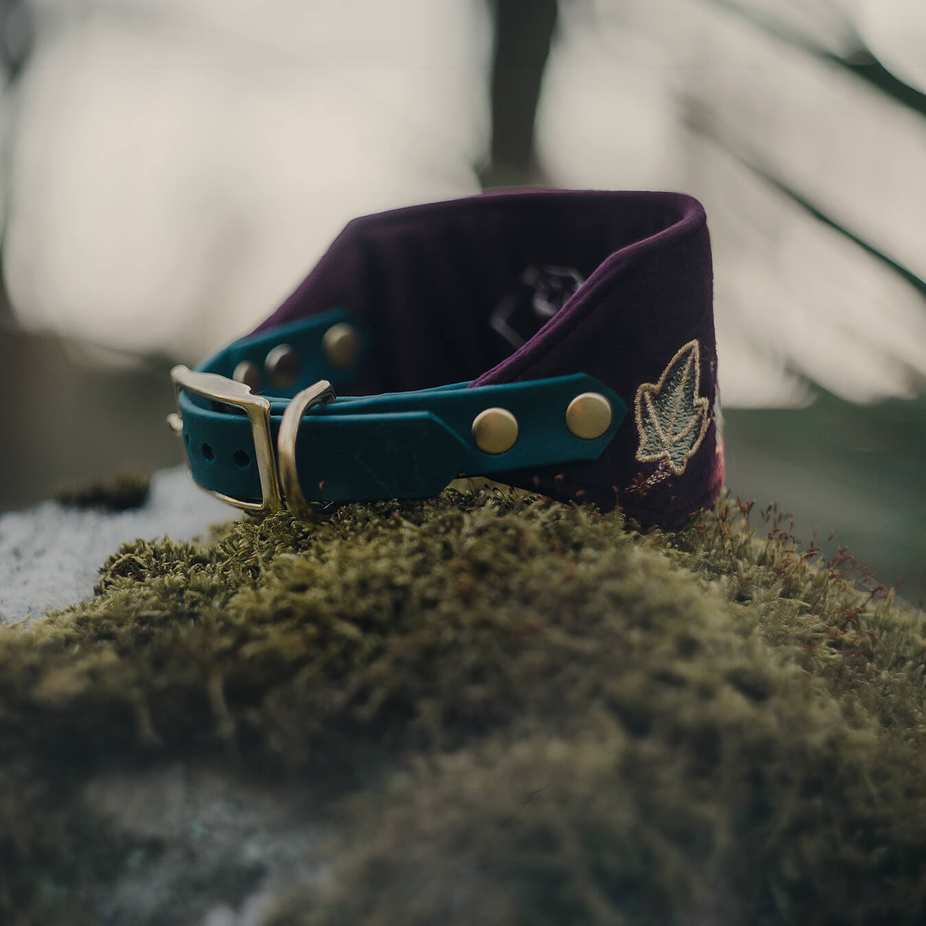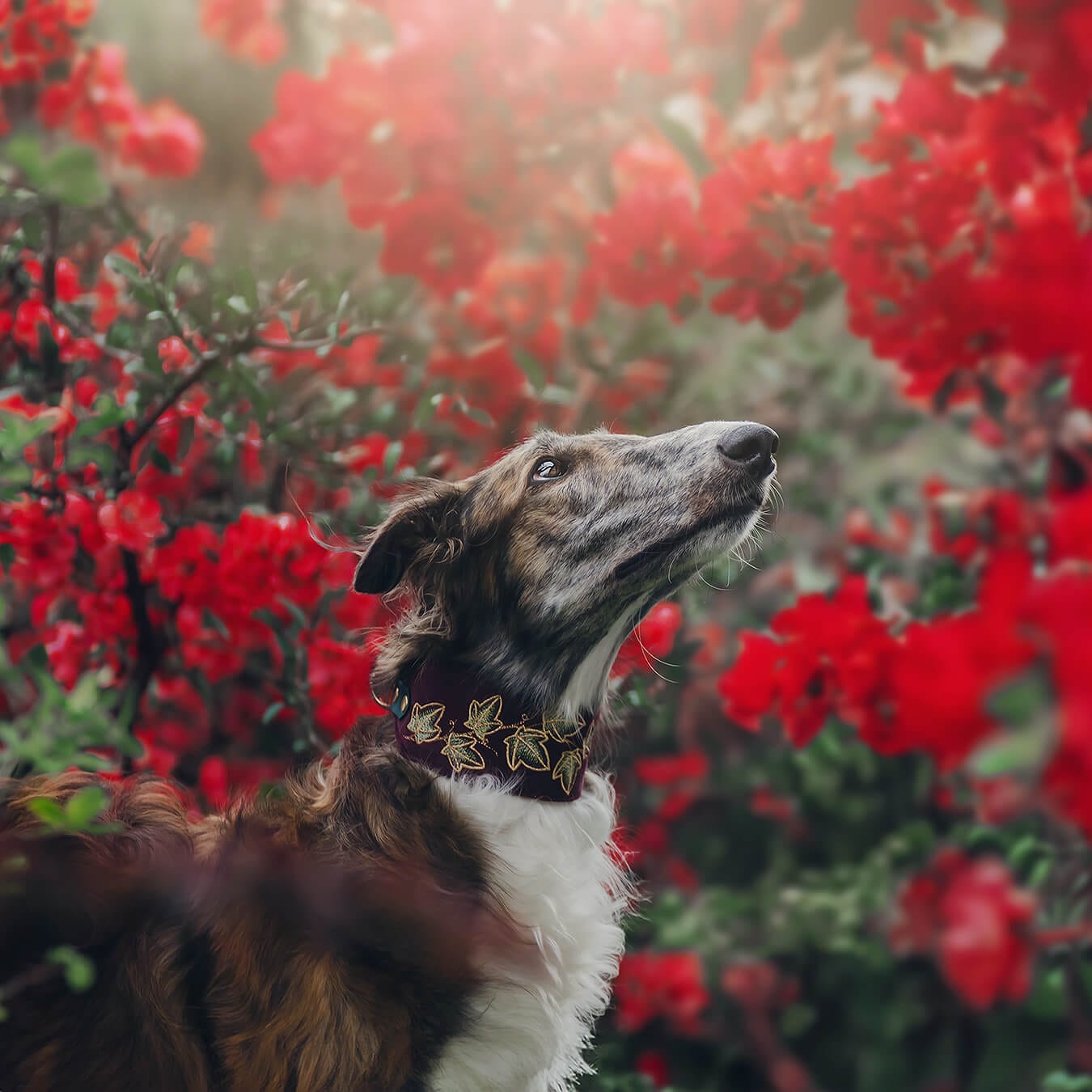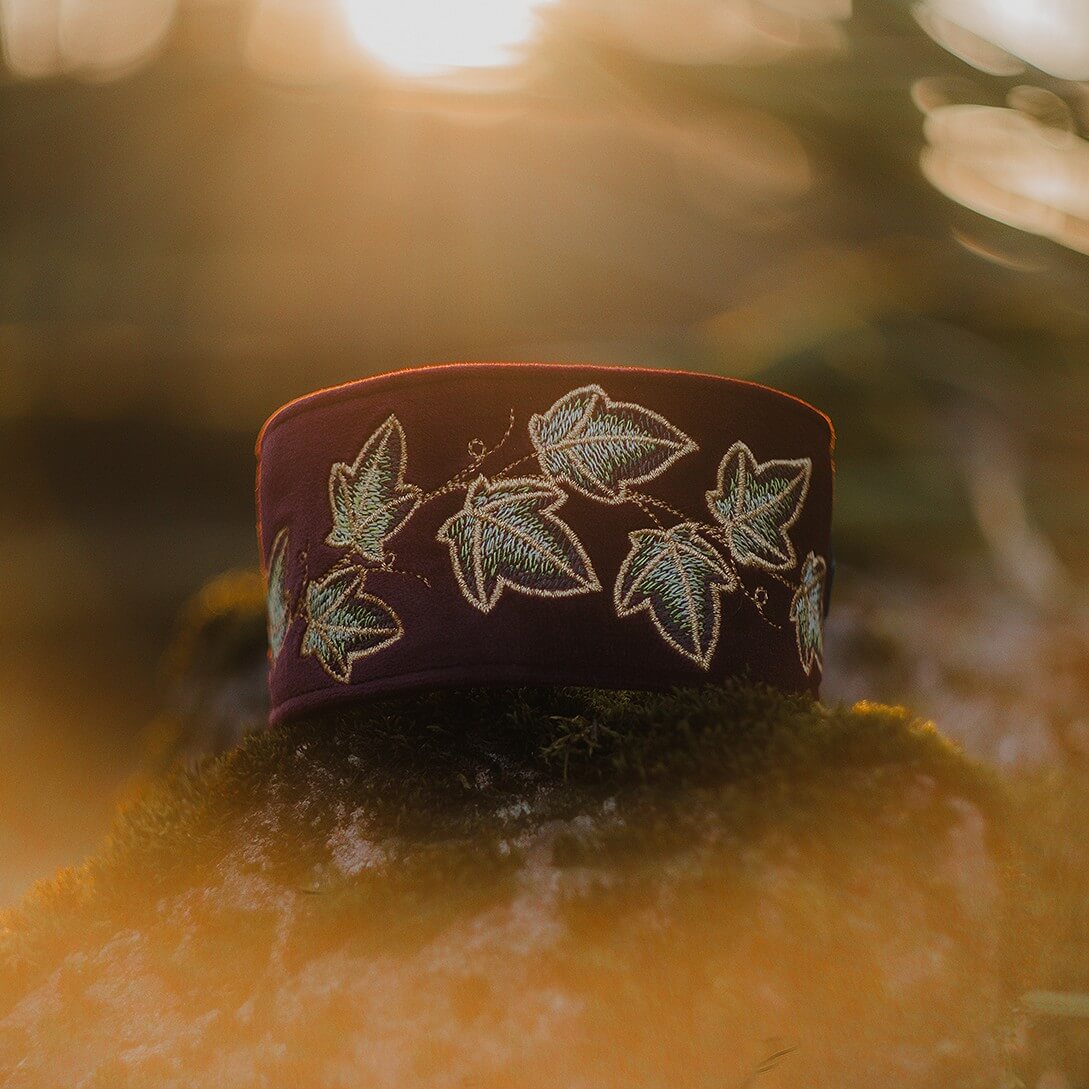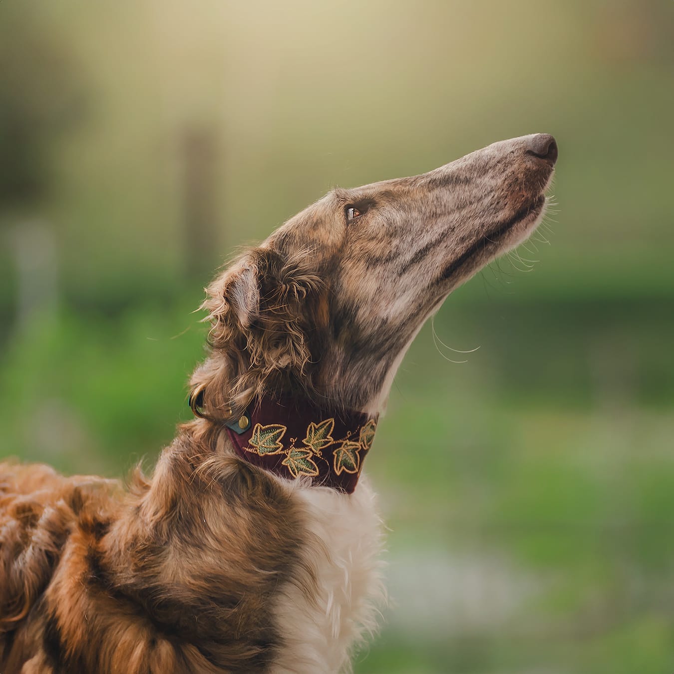 Stylowa obroża wykonana z miękkiego welwetu w kolorze Baśniowy Burgundowy, z eleganckim haftem bluszczu, ozdobionym nicią metaliczną.
