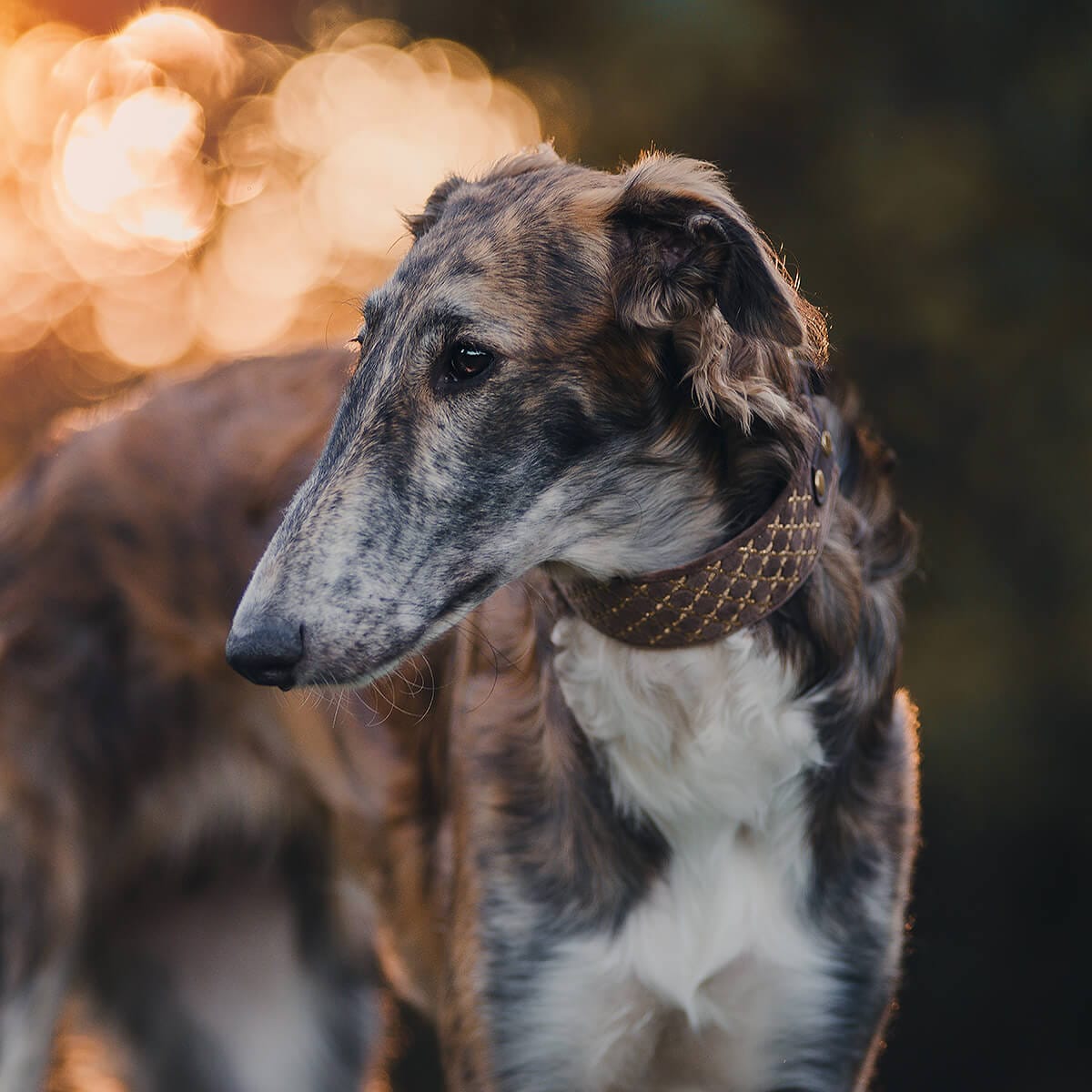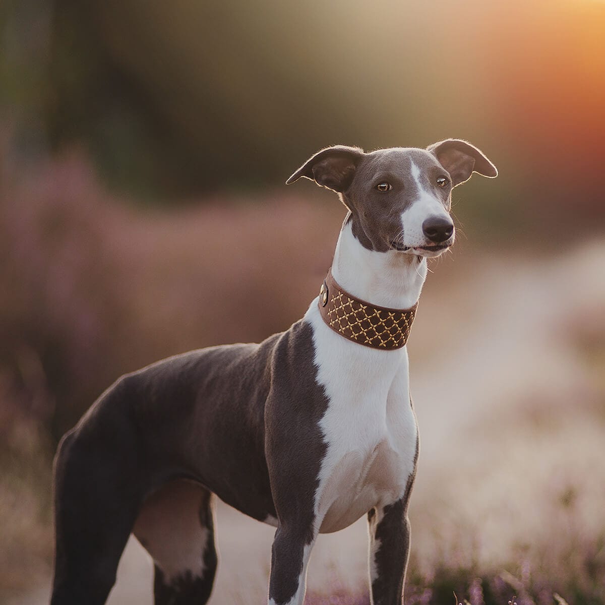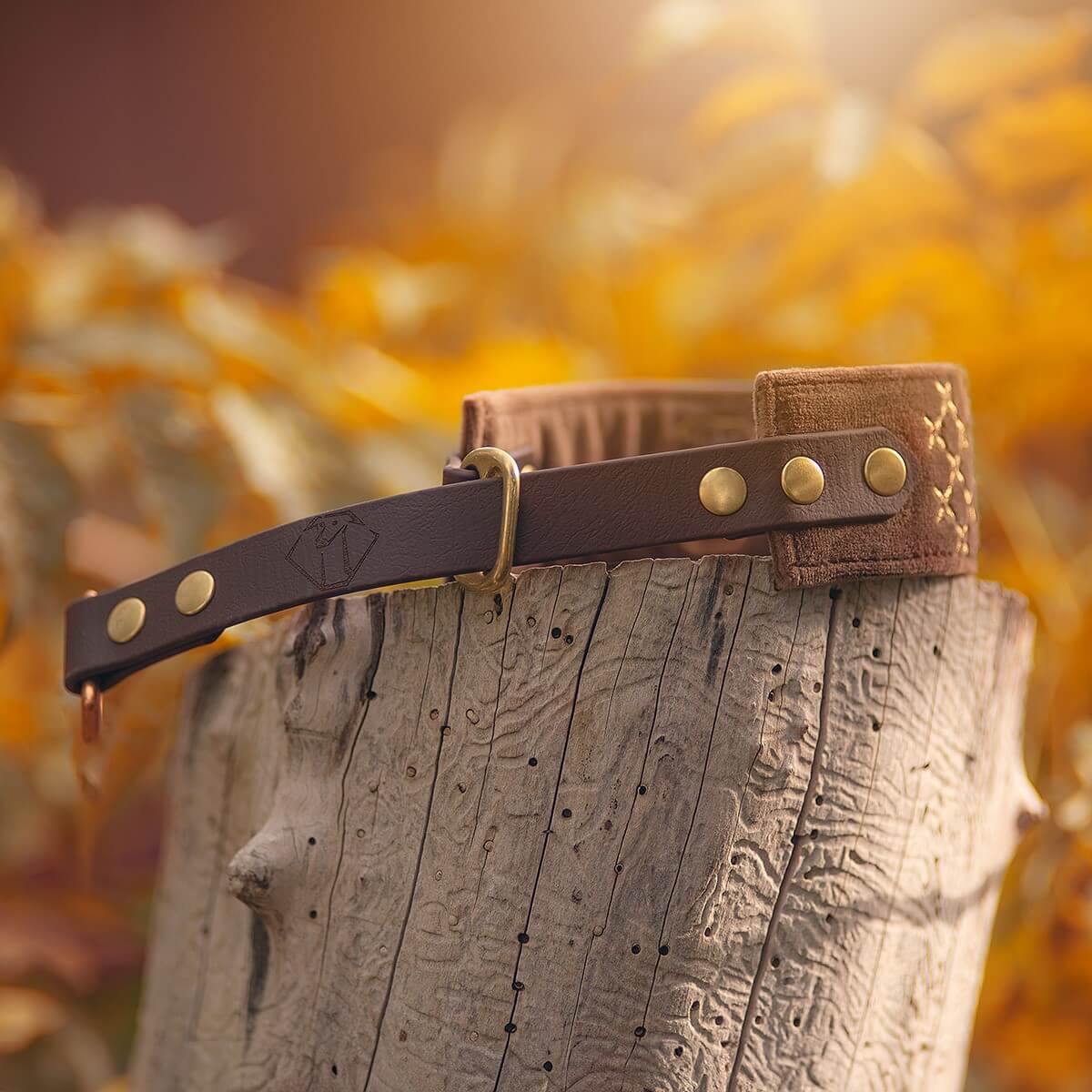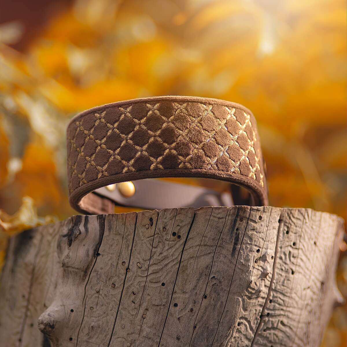 Stylowa obroża wykonana z miękkiego welwetu w kolorze Czuły Czekoladowy, ze złotym haftem wykonanym nicią metaliczną. Haft pięknie mieni się w słońcu.
