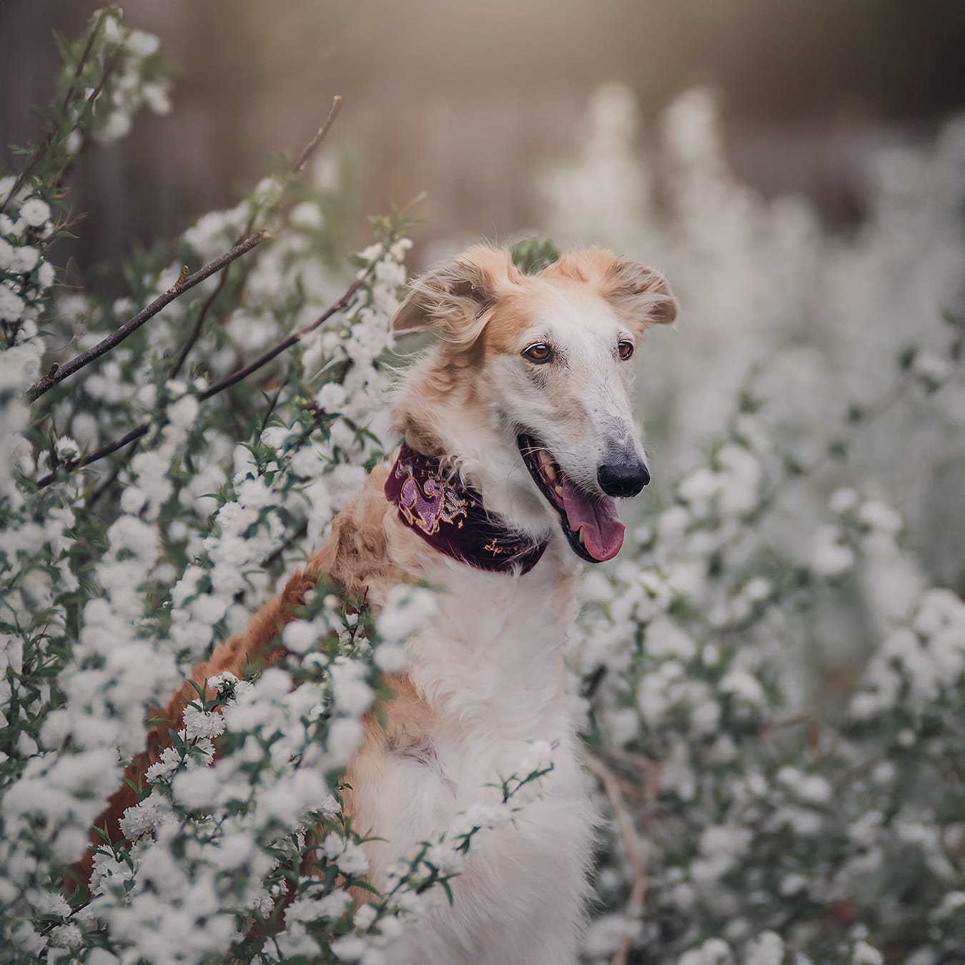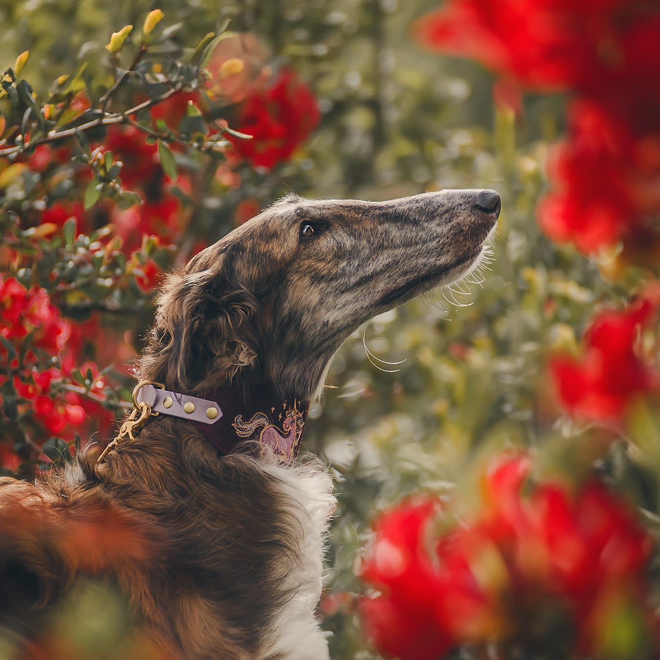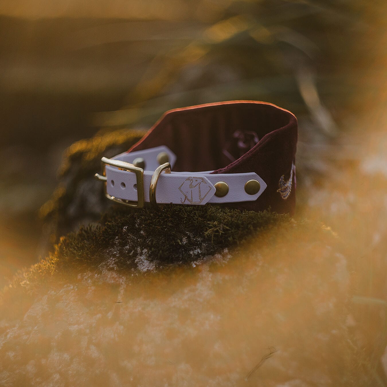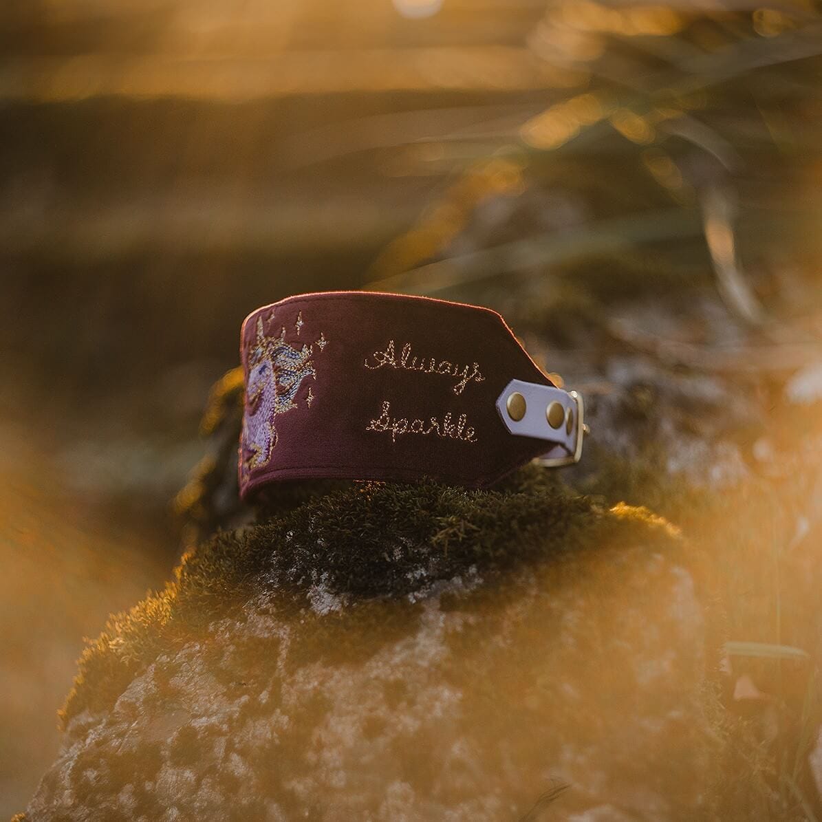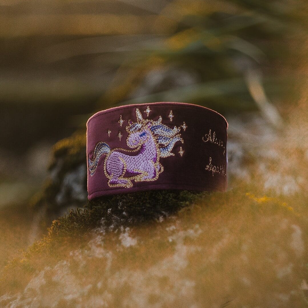 Stylowa obroża wykonana z miękkiego welwetu w kolorze Baśniowy Burgundowy, z haftem jednorożca, ozdobionym nicią metaliczną.