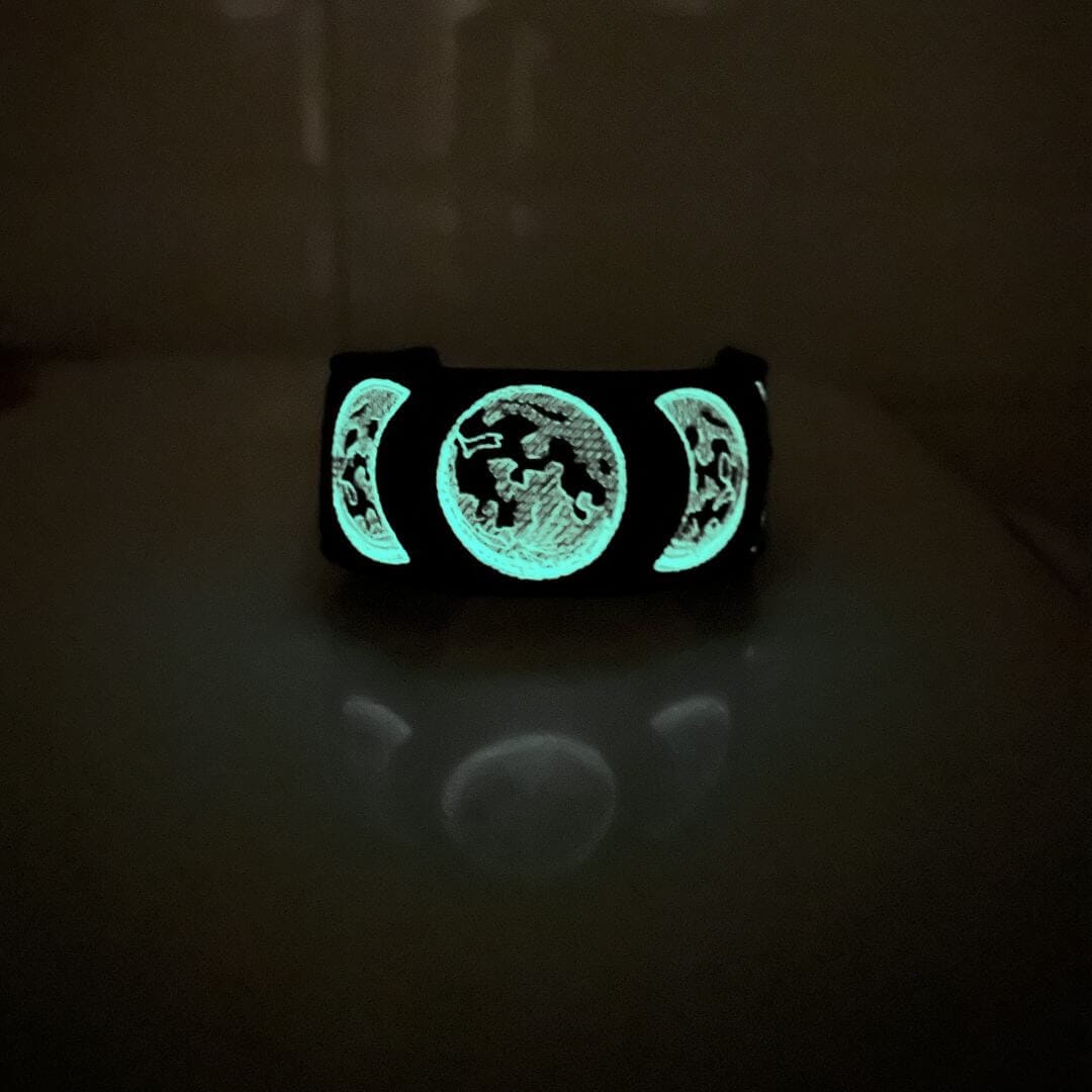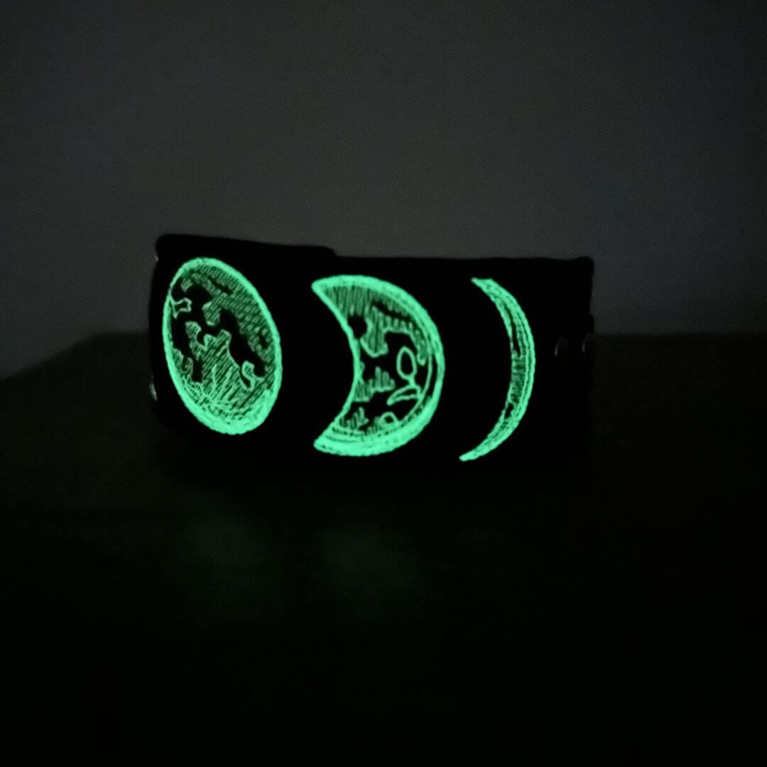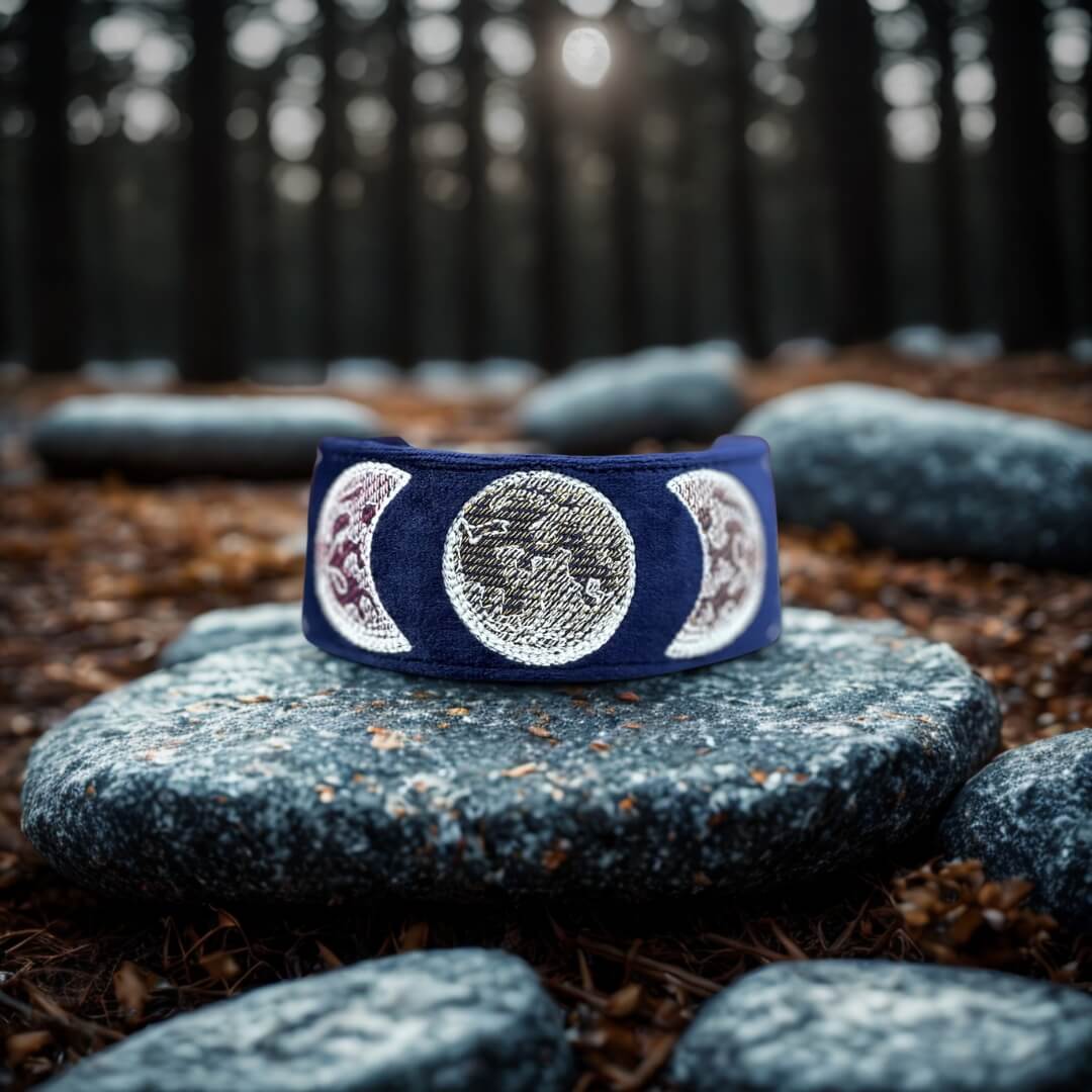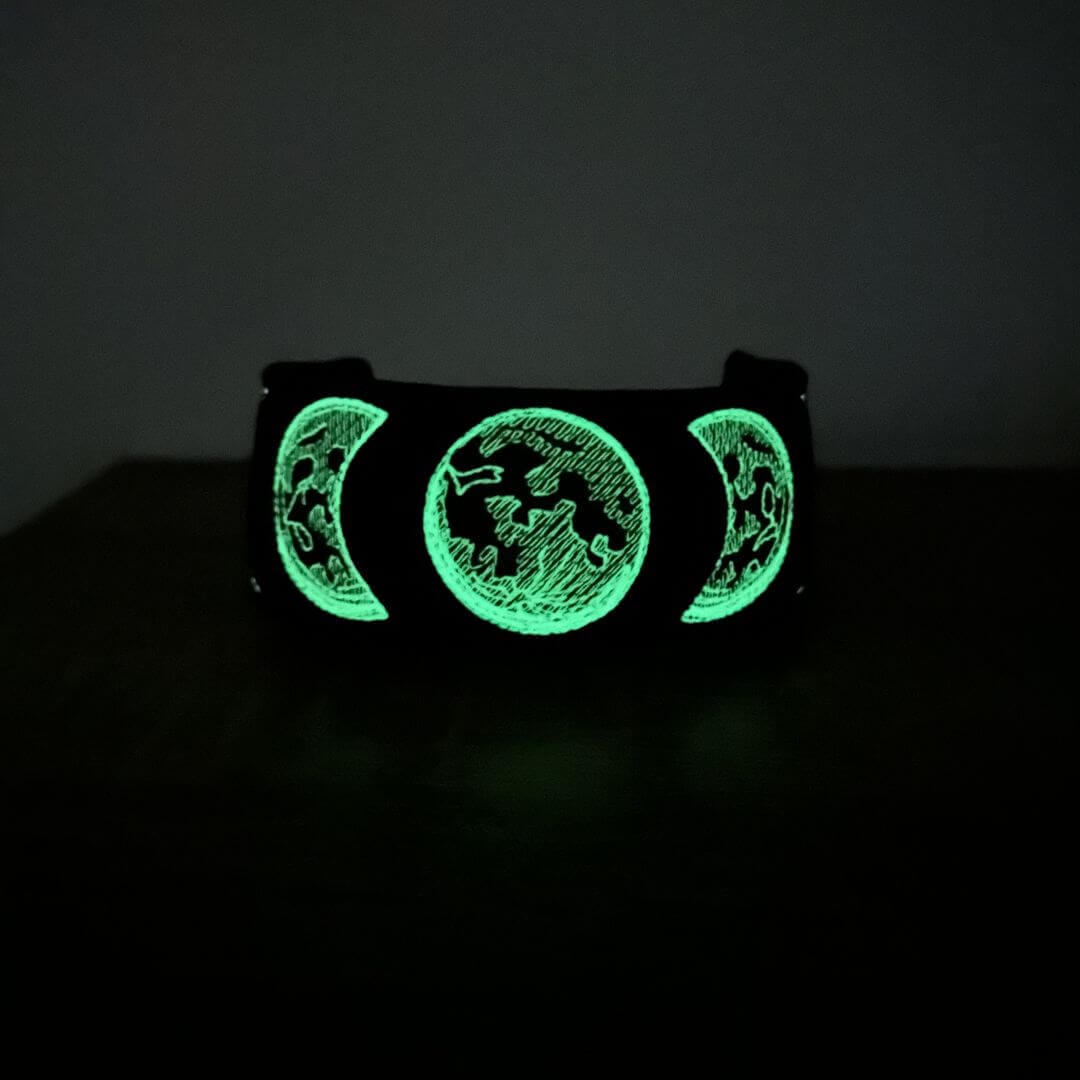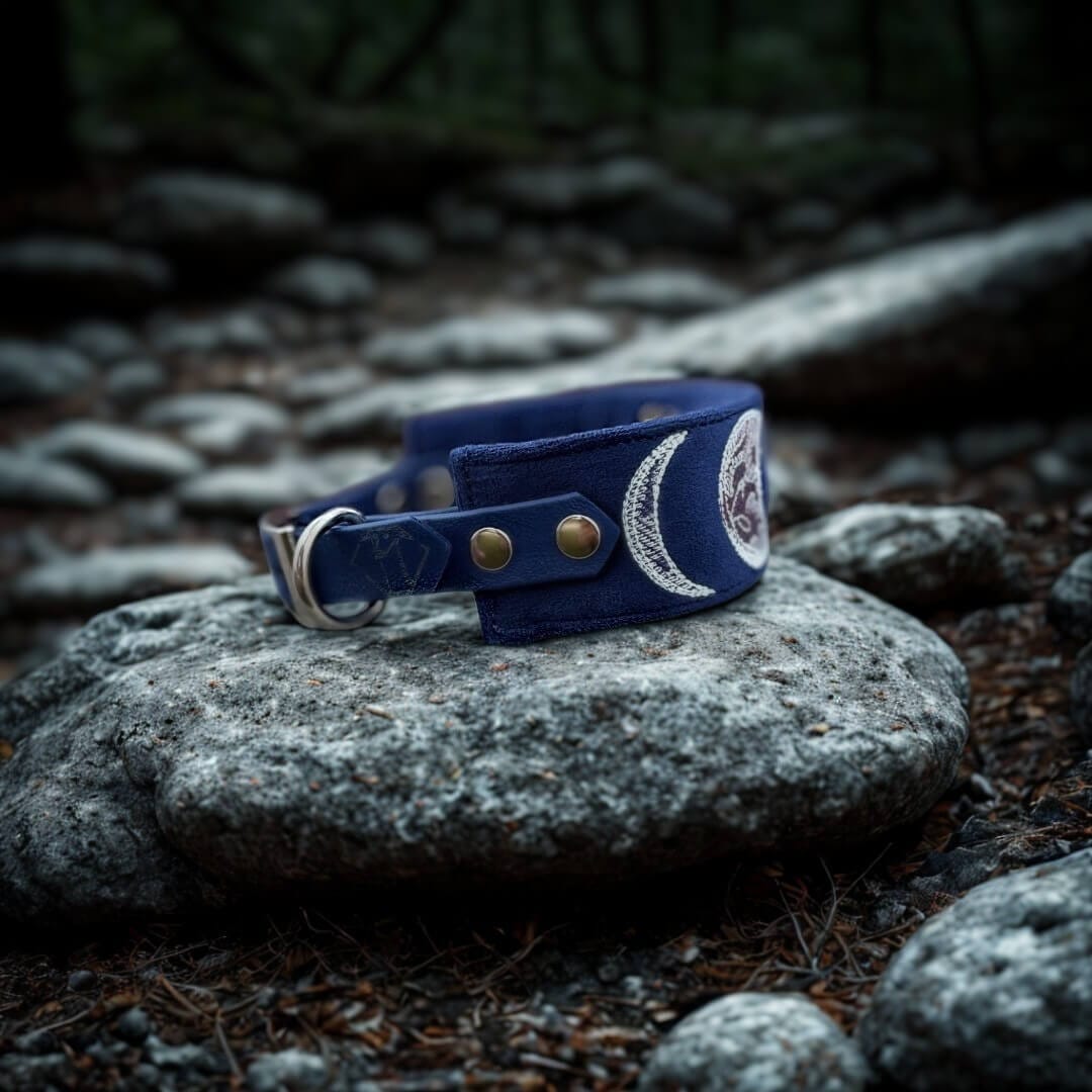 Stylowa obroża wykonana z miękkiego weluru w kolorze Atrakcyjny Atramentowy , ozdobiona haftem z motywem faz księżyca. Wierzchnia warstwa haftu została wykonana nicią fluorescencyjną.∗